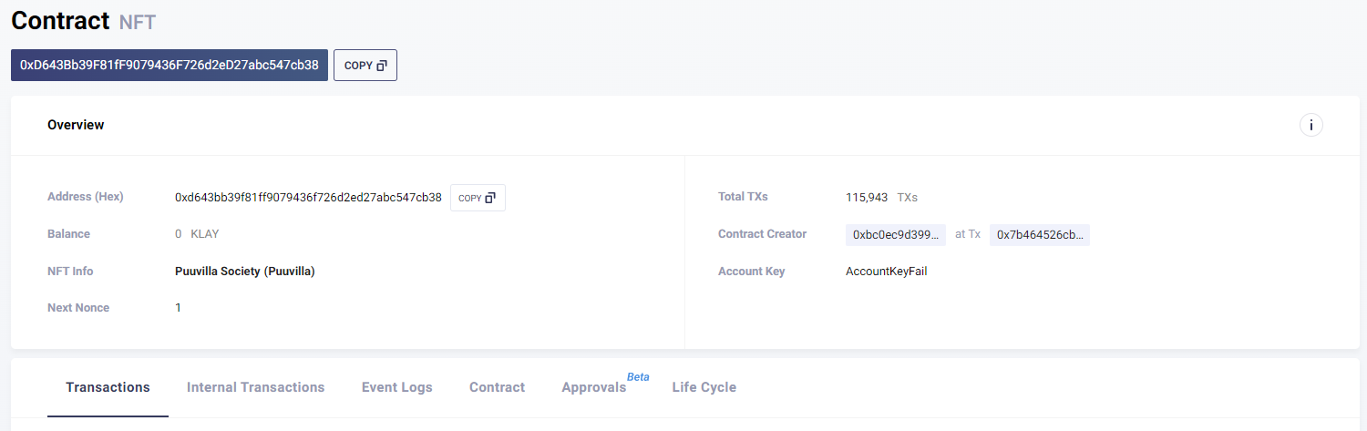 다음과 같이 저희가 살펴보던 Puuvilla Society NFT에 대한 정보가 나오게 됩니다. 이러한 과정이 코드로 구현될 것이기 때문에 알아두시면 좋습니다.