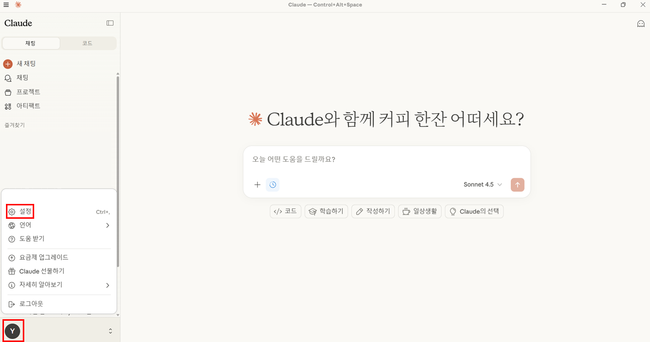 이제 해당 MCP 서버를 Claude Desktop에 연결해보겠습니다. Claude Desktop의 좌측 하단을 보면 프로필이 있습니다. 프로필을 클릭하고 설정을 선택해 줍니다.