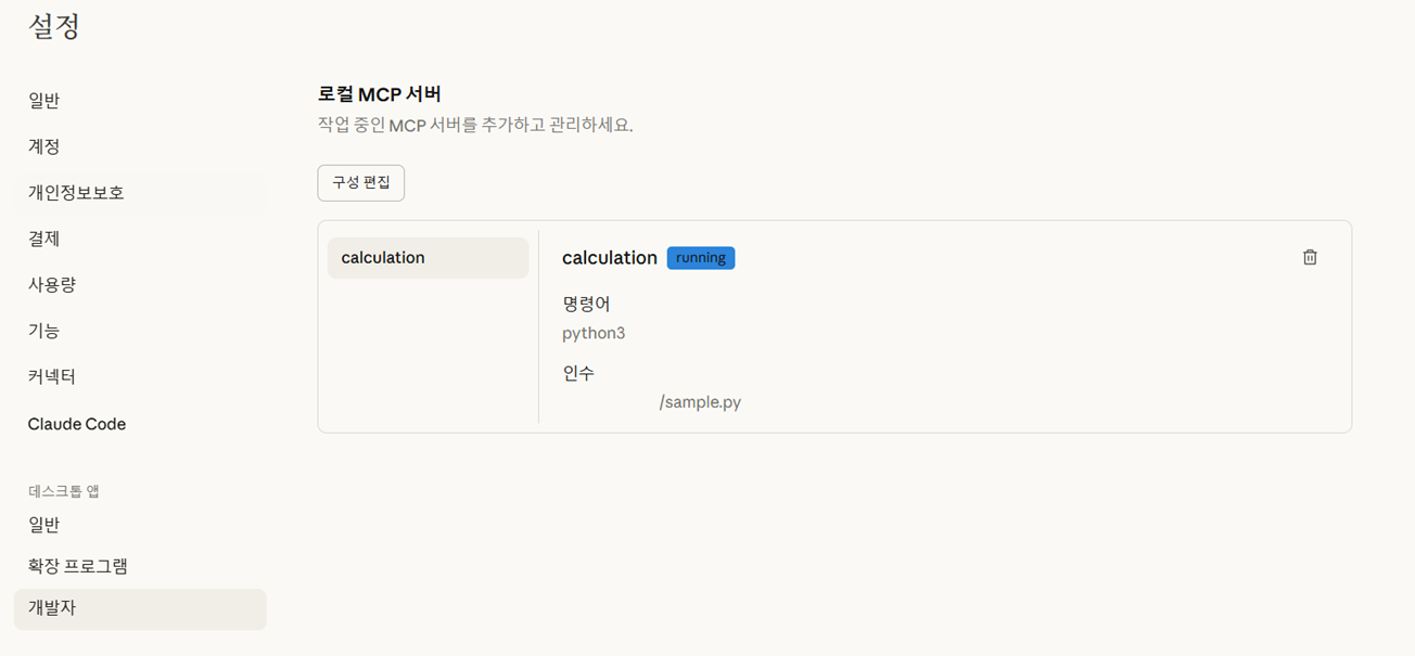 Claude Desktop 재실행 후, 다시 개발자 탭으로 돌아가면 로컬 MCP 서버가 추가되고 실행(running)이 되는 것까지 확인할 수 있습니다.